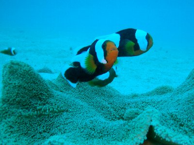 真っ白な砂地にポツンとあるイソギンチャクに住んでいるトウアカクマノミ。