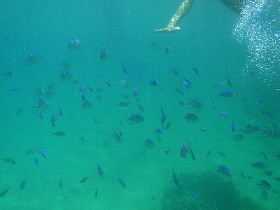 おっきいお饅頭のようなヒトデを見た後に、少し移動するとこんなに近くまで熱帯魚が寄ってきてくれます!