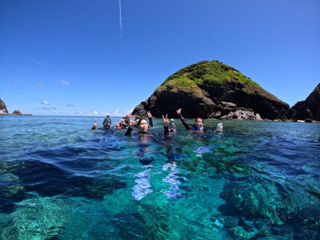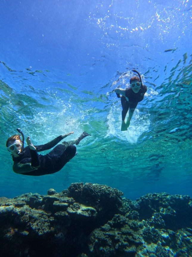 Here’s a big “Hi” from the snorkeling team, surrounded by what looked and felt like almost-alive bright-blue water. What a way to wrap up a perfect day at the sea.