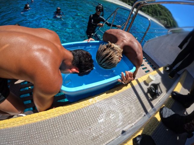 Yep, you read that right. Despite being surrounded by an entire ocean, we held our breath in a small water tub. Don’t ask why—it just happened.