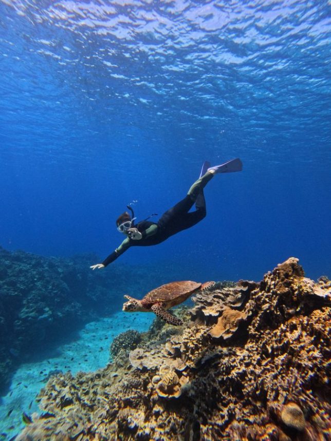 In our last snorkeling spot, we spotted three Hawksbill Sea Turtles (Eretmochelys imbricata) gliding gracefully through the turquoise water. We got some beautiful shots as they swam by!