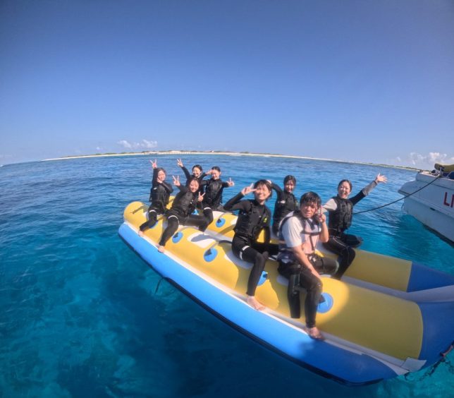 バナナボートは大人数で乗れるため複数人の団体様でもみんな一緒にできますよ~~