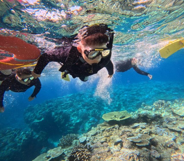 三本目はパライソ。白い砂地と広がる珊瑚のコントラストが美しく、さらにキラキラと光る丁香魚の群れが目の前に広がり、まさに楽園のような景色。みんなの笑顔も自然と広がって、最高の時間になりました。
