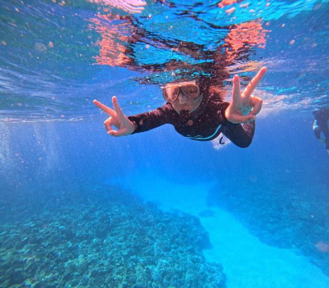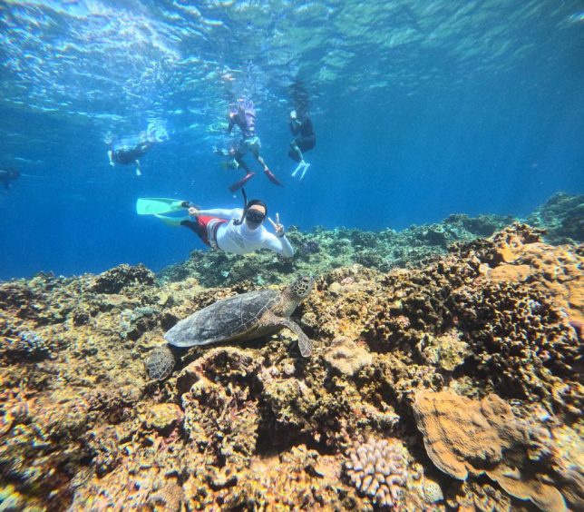 二本目はサンドラー。ここではなんと!二種類の海龜に出会えました。甲羅の模様が特徴的な玳瑁と、ゆったりした雰囲気の綠蠵龜。お客さんたちも大興奮で、海龜と一緒に泳げてとても楽しそうでした。