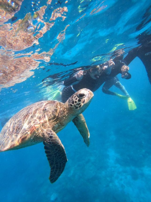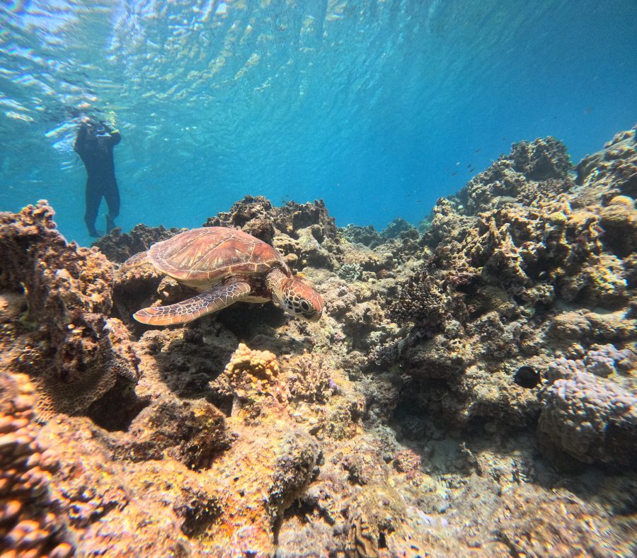 Can you see that brown oval shape in the blue sea? When sea turtles come close to the surface, their shell contrasts beautifully with the water — making them easier to spot from a boat or the shore. Here’s how it looks from underwater. 🐢💙
