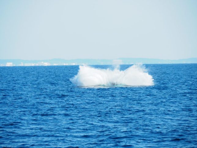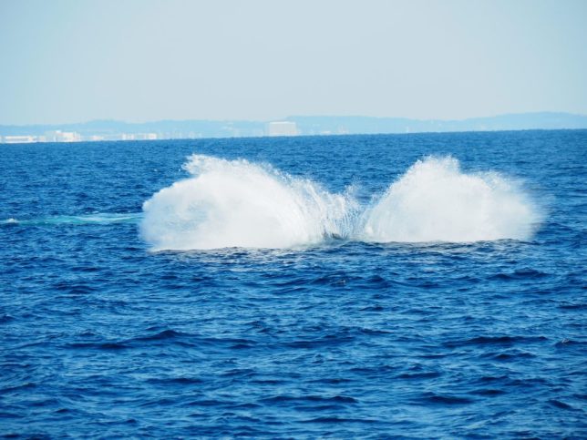 親子クジラを発見したのち、次はどこから水面に上がってくるか皆で待ち構えていたら突然目の前で大ブリーチング〜❣️ 親クジラの最高のパフォーマンスを見てみんなテンション最高でした‼︎