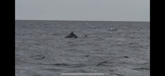 今天在海面上,我有幸目睹了生命中最動人的一幕。在翻騰的海浪間,出現了一對令人屏息的身影——那是鯨魚媽媽正帶著剛出生的寶寶在玩耍。
